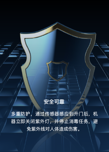 多重防護,通過傳感器感應(yīng)到開門后,機器立即關(guān)閉紫外燈,并停止消毒任務(wù),避免紫外線對人體造成傷害。