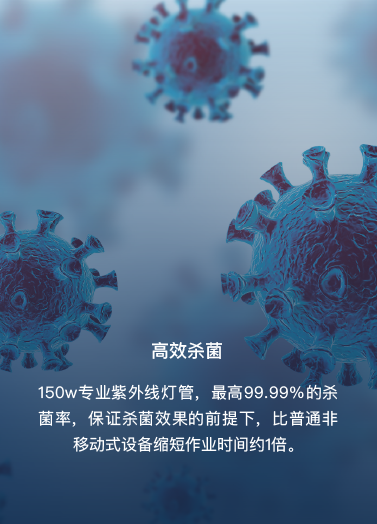 150w專業(yè)紫外線燈管,最高99.99%的殺菌率,保證殺菌效果的前提下,比普通非移動(dòng)式設(shè)備縮短作業(yè)時(shí)間約1倍。