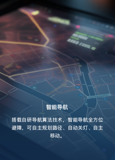 搭載自研導(dǎo)航算法技術(shù),智能導(dǎo)航全方位避障,可自主規(guī)劃路徑、自動(dòng)關(guān)燈、自主移動(dòng)。