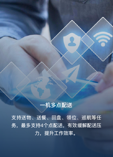 支持送物、送餐、回盤、領(lǐng)位、巡航等任務(wù),最多支持4個(gè)點(diǎn)配送,有效緩解配送壓力,提升工作效率。